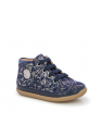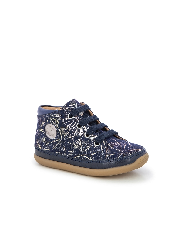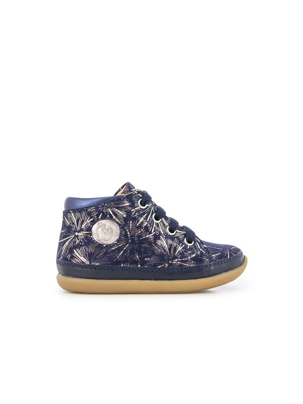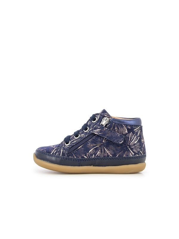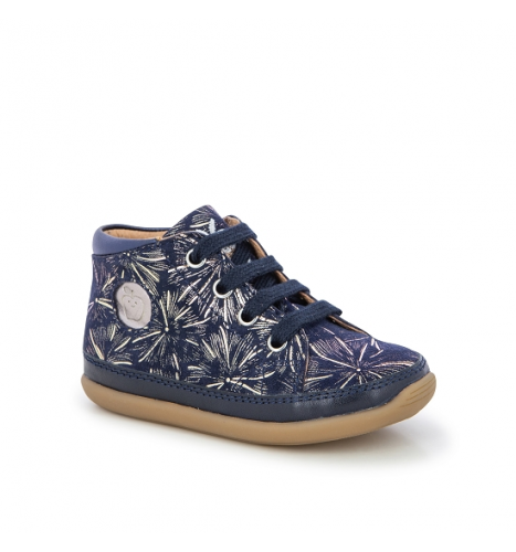 Chaussure premiers pas mi-montante. Légère et doté d'une semelle souple et très flexible pour le bon déroulement du pied et une tige haute pour un bon maintien de la cheville. Elle se chausse et se déchausse facilement grâce à son zip intérieur. La semelle extérieure est en caoutchouc naturel.