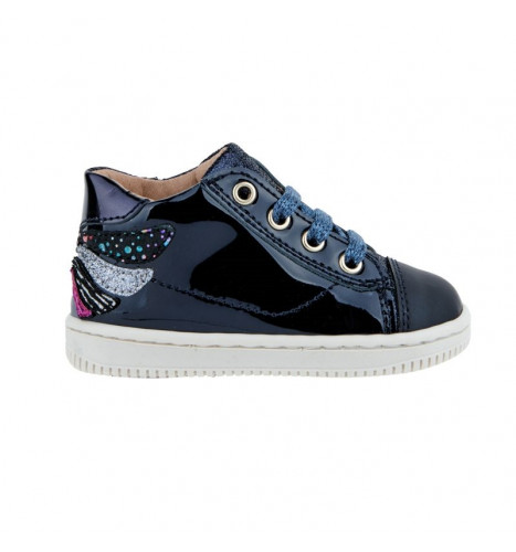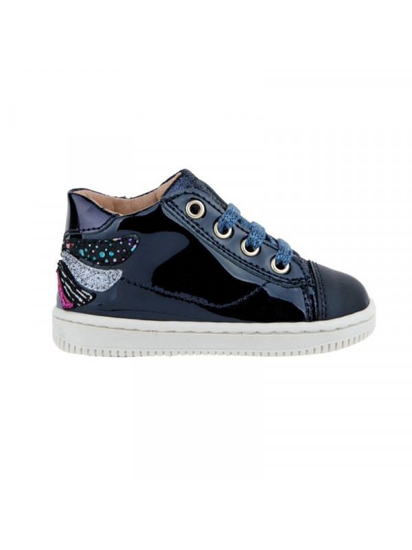 Chaussure fille premiers pas à lacets. Tige en cuir vernis marine, doublure en cuir et semelle en caoutchouc. Empiècement papillon à l'arrière de la chaussure.