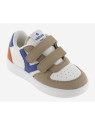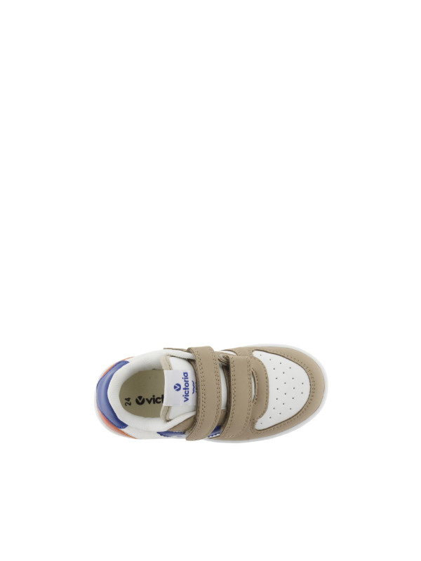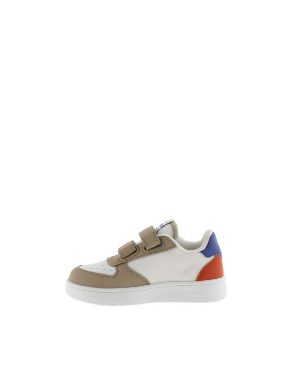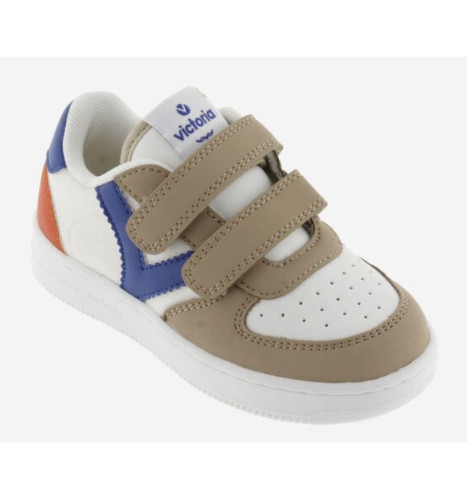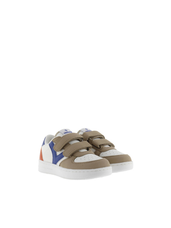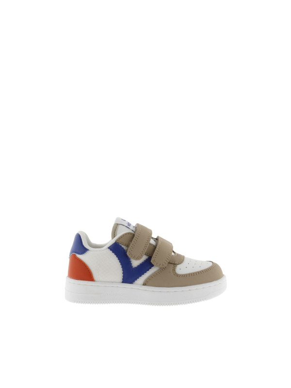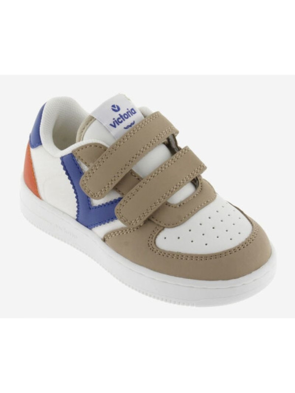Basket blanche effet cuir avec pièces en cuir fendu contrastantes. Logo rétro de victoria sur le côté. Elles s'ajustent parfaitement au pied grâce à leur fermeture à scratch. Elles se distinguent également par leur grande légèreté.