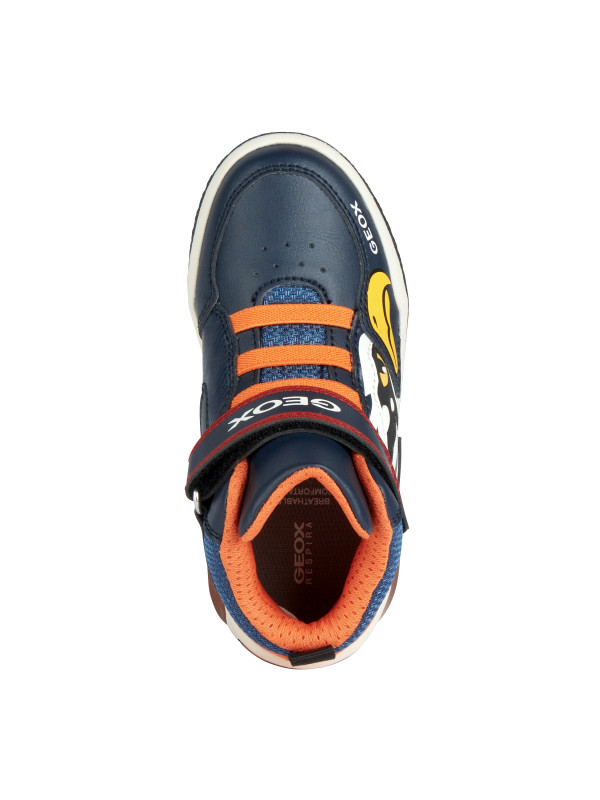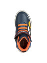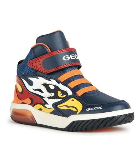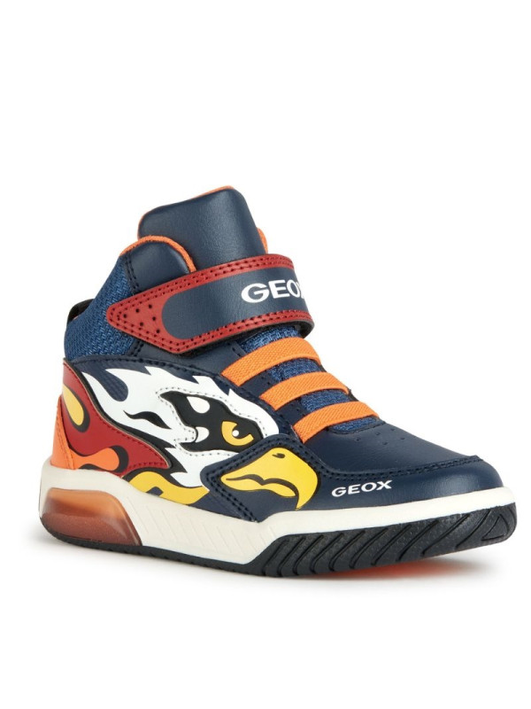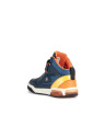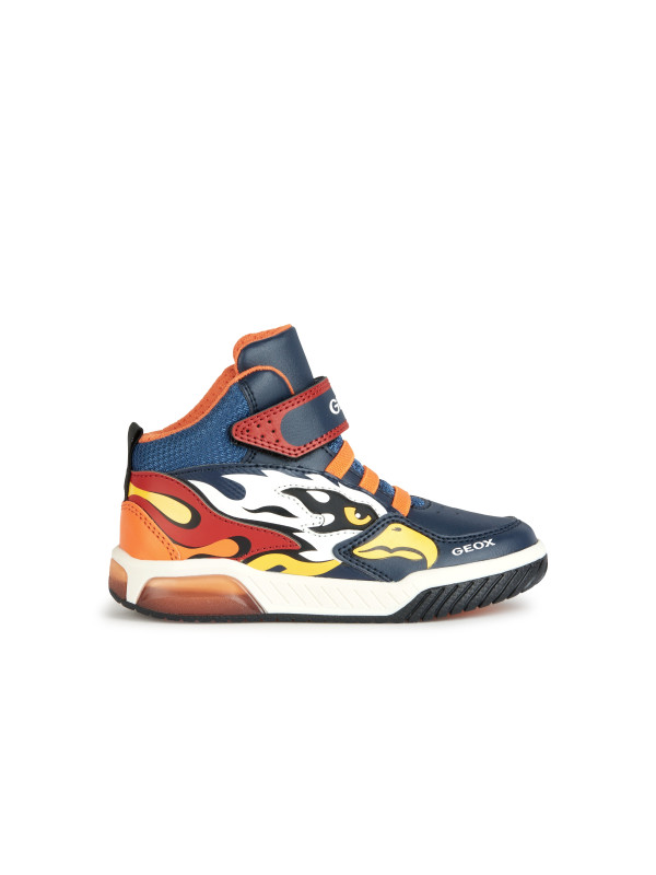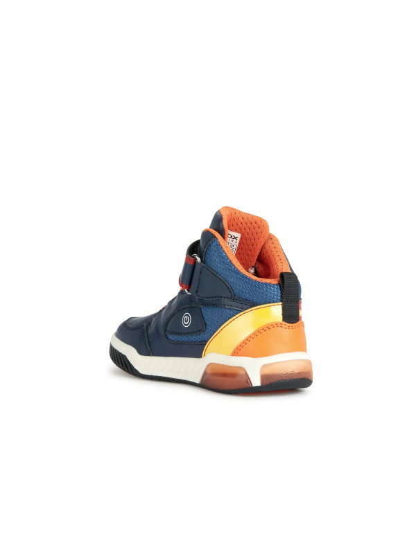 sneakers semi-montantes pour garçon d’inspiration active, au design mordant et dynamique. Proposées dans une vive association de bleu marine et orange, les Inek plaisent aux enfants avec leur tige ornée d’imprimés multicolores et leurs lumières intégrées dans la semelle extérieure. Légères, souples et respirantes, ces chaussures sont réalisées en matière à effet cuir foulonné et tissu et dotées d’une fermeture à lacets élastiques et scratch.