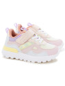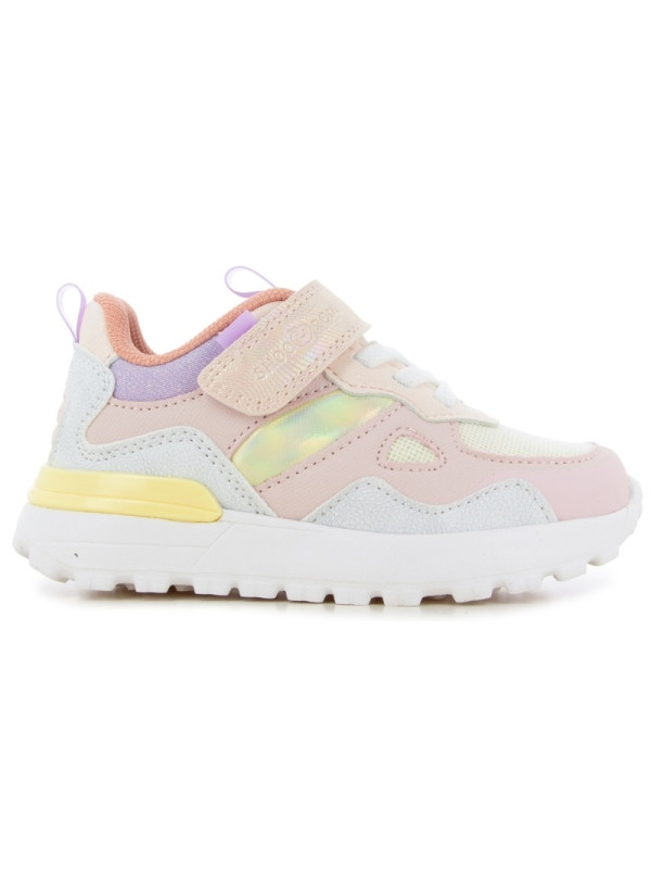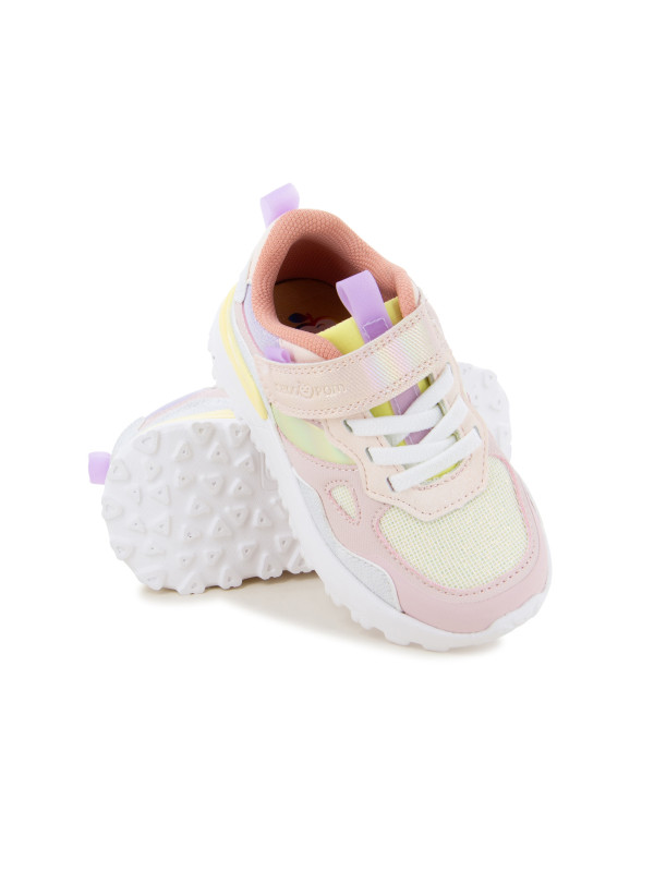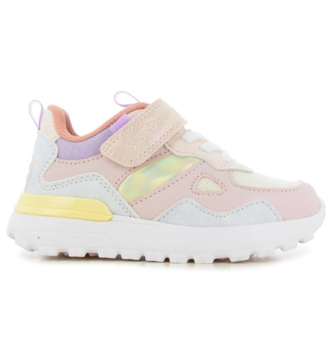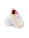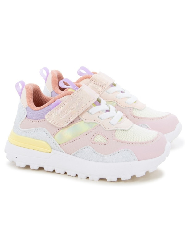 Cette basket pour enfants est présentée dans une version en textile pailleté et rose. Cette chaussure souple et légère se chausse et se déchausse facilement grâce à ses lacets élastiques et son scratch.