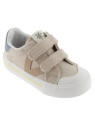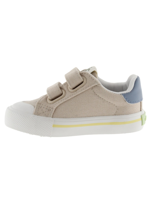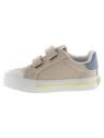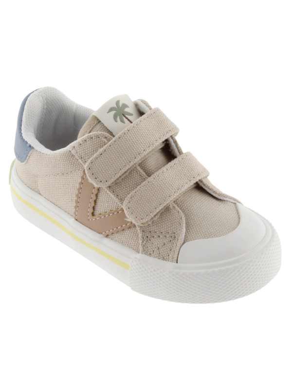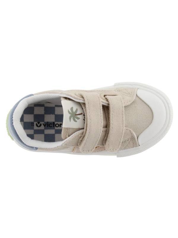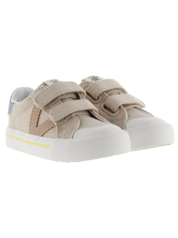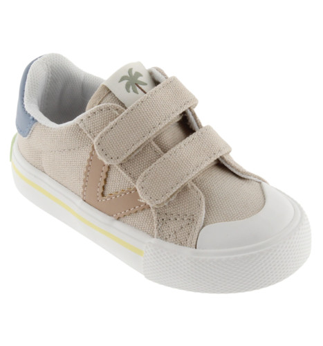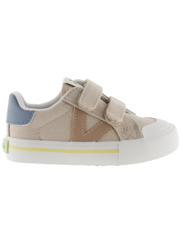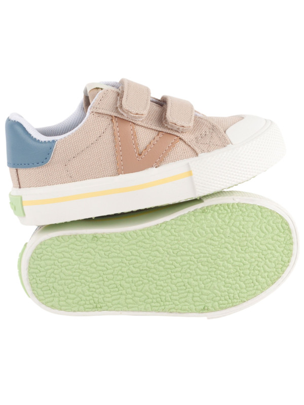 Baskets de sport pour enfant avec le V de victoria sur le côté, en contraste avec l'arrière. Étiquette sur la languette avec motif imprimé glace. Fermeture à double scratch pour permettre un meilleur ajustement et faciliter le chaussage. Renfort en caoutchouc sur la pointe pour plus de résistance et de longévité. Semelle intérieure haute densité à imprimé vichy pour plus de confort.