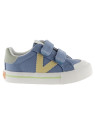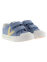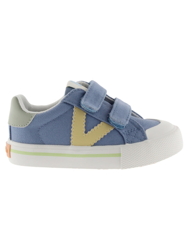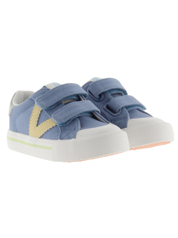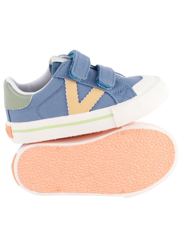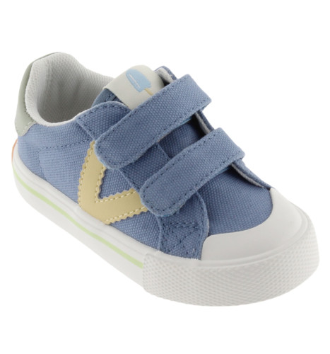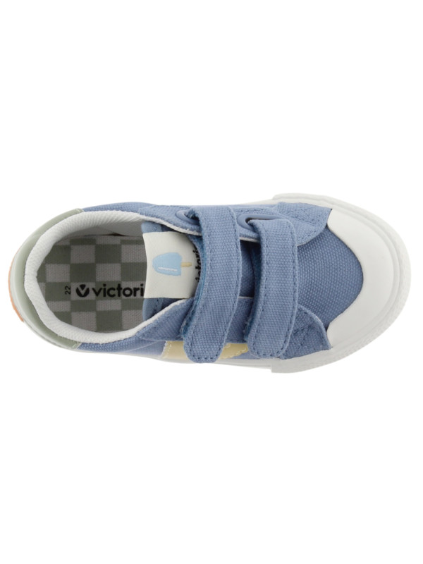 Baskets de sport pour enfant avec le V de victoria sur le côté, en contraste avec l'arrière. Étiquette sur la languette avec motif imprimé glace. Fermeture à double scratch pour permettre un meilleur ajustement et faciliter le chaussage. Renfort en caoutchouc sur la pointe pour plus de résistance et de longévité. Semelle intérieure haute densité à imprimé vichy pour plus de confort.