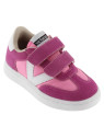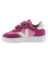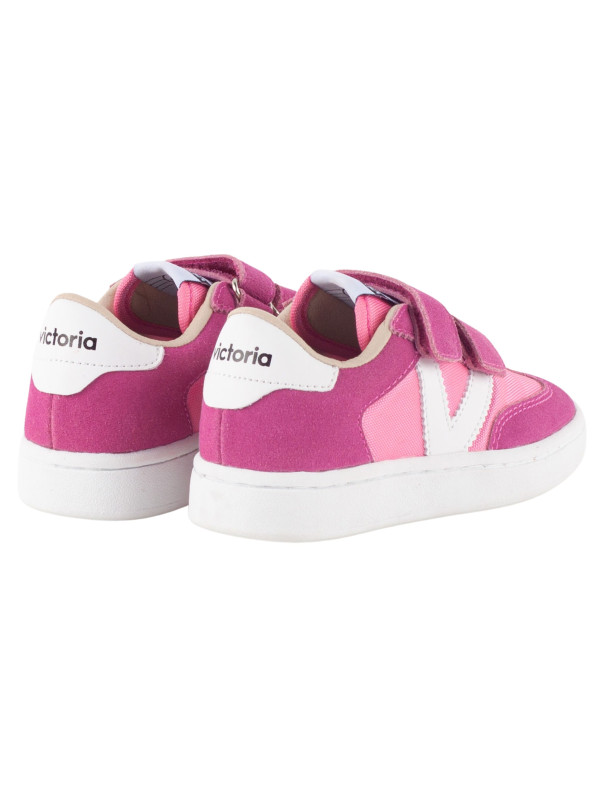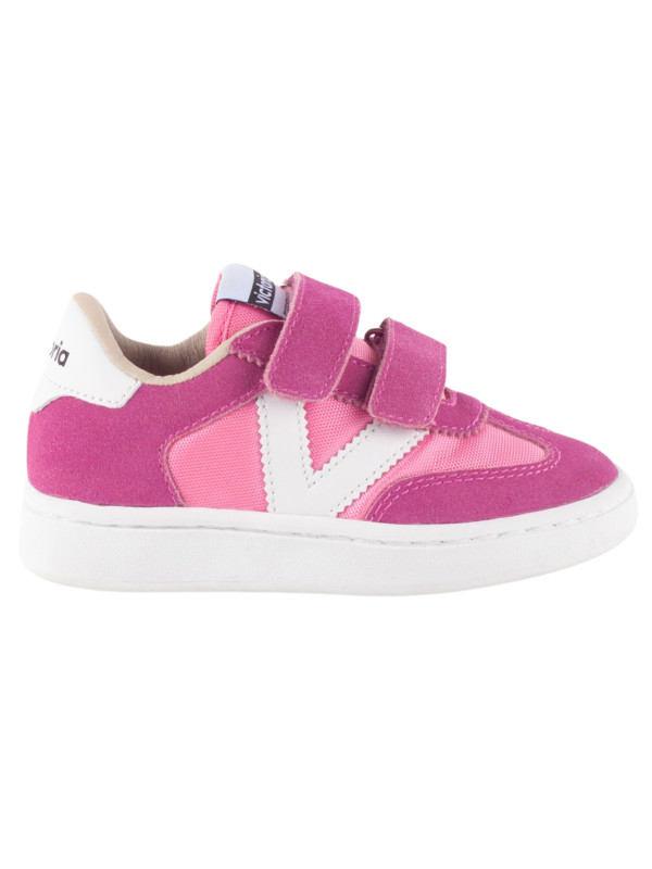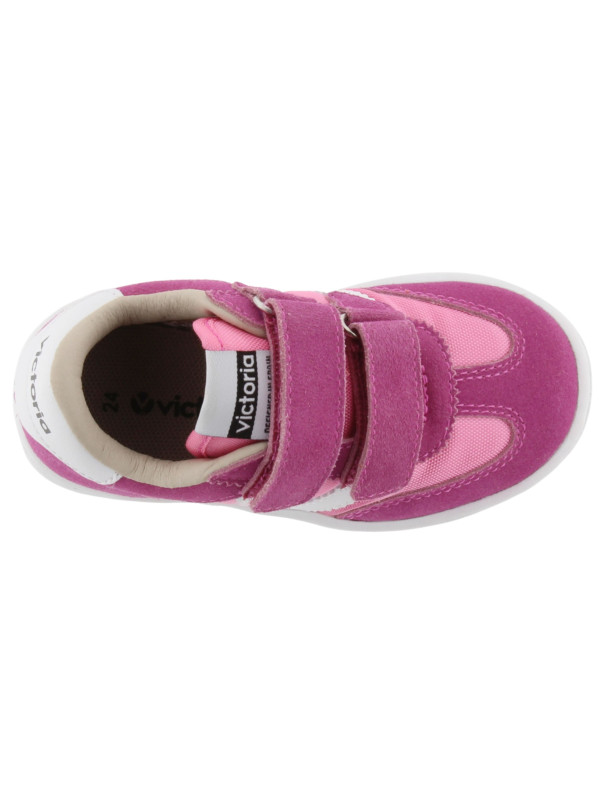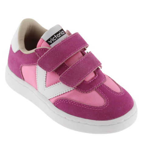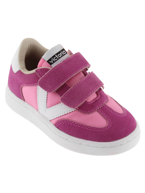 Baskets de sport pour enfants en nylon et pièces en cuir fendu et effet cuir superposées. Logo victoria gravé à l'arrière et nouvelle coupe cycliste sur la pointe pour une touche de style supplémentaire. Fermeture à double scratch pour un chaussage plus facile et un ajustement parfait.