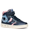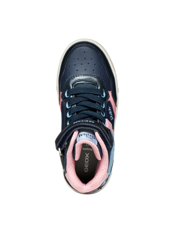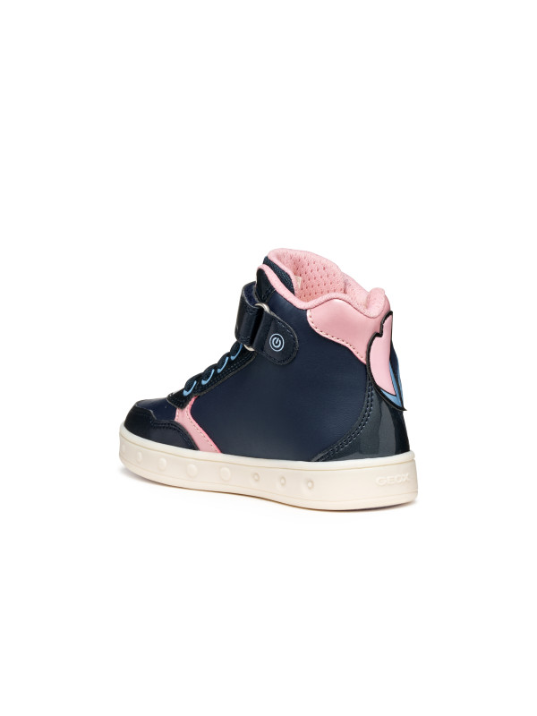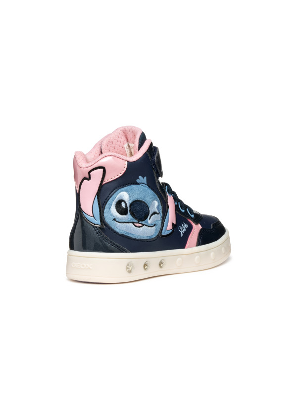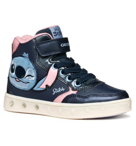 Baskets semi-montantes pour fille à l’esprit décontracté, nées de la collaboration entre Geox et Disney. Proposées ici dans une variante bleu marine et rose avec des décorations dédiées au personnage de Stitch, ces chaussures sont dotées de lumières intégrées dans la semelle extérieure. Réalisées en matière à effet cuir, cuir verni et matière à effet cuir nacré, les Skylin complètent avec une note amusante et originale les looks les plus sportifs.