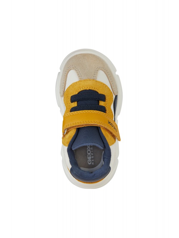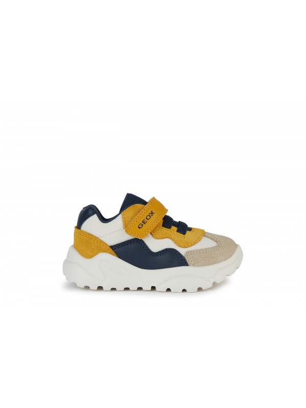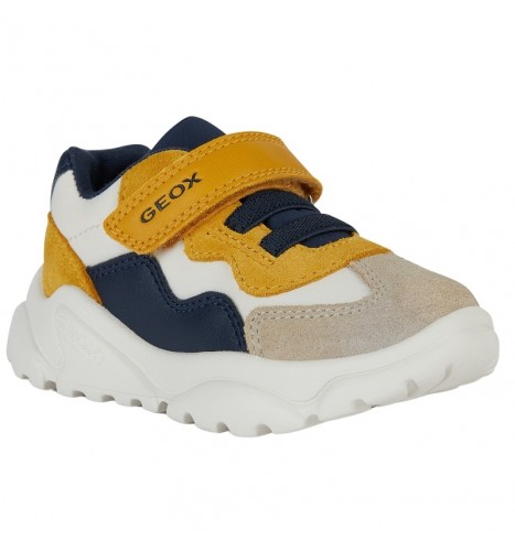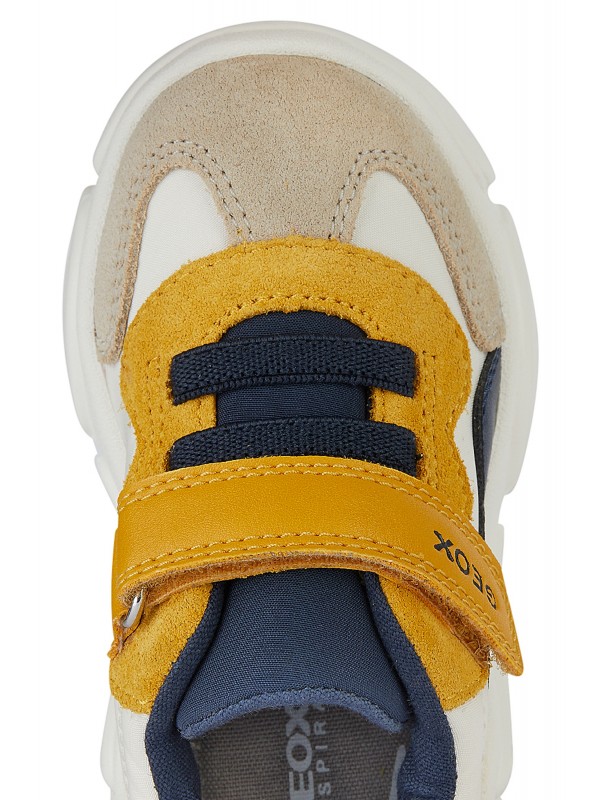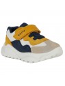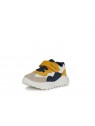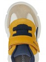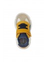 Sneakers pour bébé garçon au style dynamique et sportif, dotées d’une structure souple qui accompagne à la perfection les mouvements des petits pieds lors de l’exploration. Dans cette variante qui associe le bleu marine, le taupe et l'ocre, les Ciufciuf sont réalisées en matière à effet cuir et nylon, gage de résistance et de douceur au toucher. Idéales pour les activités quotidiennes, elles accompagnent les premiers pas avec le maintien nécessaire et un design décontracté parfait pour toutes les occasions de jeu.