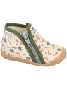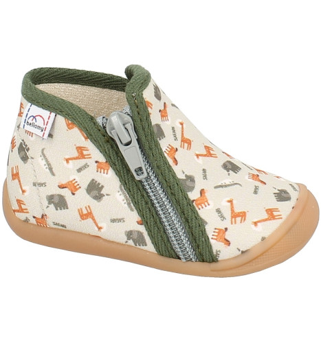 Ces Chaussons de la GAMME TITI sont des chaussures d’appartement entièrement fabriquées en France. La hauteur de tige et la fermeture zip assurent le meilleur maintien possible du pied de l’enfant. La première intérieure est en cuir naturel. La semelle est injectée avec un matériau antidérapant et ultra-résistant. Ce modèle est fabriqué 100% en France. Toutes les étapes de fabrication y sont effectuées : la coupe, la piqure (couture), et l’injection de la semelle sont intégralement réalisée dans notre Atelier de Fabrication dans le Maine et Loire (70 collaborateurs en 2022). BELLAMY est la société qui fabrique intégralement le plus de chaussures enfants en France par an. La chaussure est constituée de textile pour le dessus et la doublure. La première de propreté est en cuir naturel. Mêlez à tous ces ingrédients le thème des animaux , les parents comme les enfants seront les plus heureux.