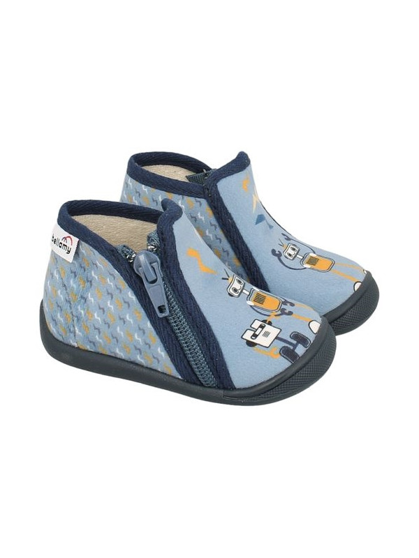 Ces Chaussons de la GAMME PAULIN sont des chaussures d’appartement entièrement fabriquées en France. La hauteur de tige et la fermeture zip assurent le meilleur maintien possible du pied de l’enfant. La première intérieure est en cuir naturel. La semelle est injectée avec un matériau antidérapant et ultra-résistant. Ce modèle est fabriqué 100% en France. Toutes les étapes de fabrication y sont effectuées : la coupe, la piqure (couture), et l’injection de la semelle sont intégralement réalisée dans notre Atelier de Fabrication dans le Maine et Loire (70 collaborateurs en 2022). BELLAMY est la société qui fabrique intégralement le plus de chaussures enfants en France par an. La chaussure est constituée de textile pour le dessus et la doublure. La première de propreté est en cuir naturel.