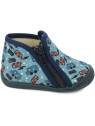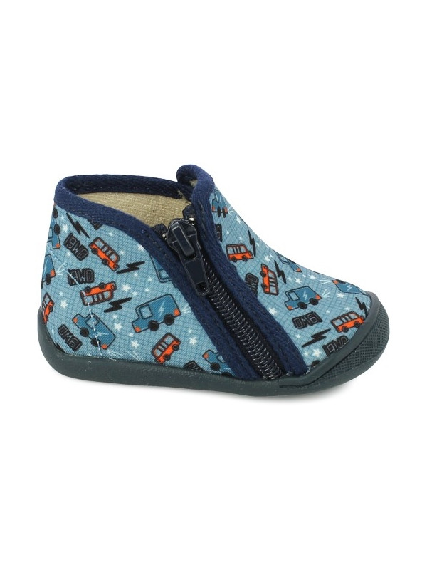Chaussons confortables pour garçon signés BELLAMY, avec une tige en textile bleu imprimée de petits camions et voitures colorés. Pratiques et faciles à enfiler grâce à leur fermeture zippée sur le côté, ils assurent un bon maitien du pied. La semelle souple et antidérapante garantit confort et sécurité pour les déplacements à la maison, crèche ou école. Un modèle ludique et fonctionnel, parfait pour accompagner les petits aventuriers au quotidien.