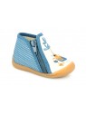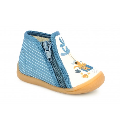 Ces Chaussons de la GAMME PAULIN sont des chaussures d’appartement entièrement fabriquées en France. La hauteur de tige et la fermeture zip assurent le meilleur maintien possible du pied de l’enfant. La première intérieure est en cuir naturel. La semelle est injectée avec un matériau antidérapant et ultra-résistant. Ce modèle est fabriqué 100% en France. Toutes les étapes de fabrication y sont effectuées : la coupe, la piqure (couture), et l’injection de la semelle sont intégralement réalisée dans notre Atelier de Fabrication dans le Maine et Loire (70 collaborateurs en 2022). BELLAMY est la société qui fabrique intégralement le plus de chaussures enfants en France par an. La chaussure est constituée de textile pour le dessus et la doublure. La première de propreté est en cuir naturel.