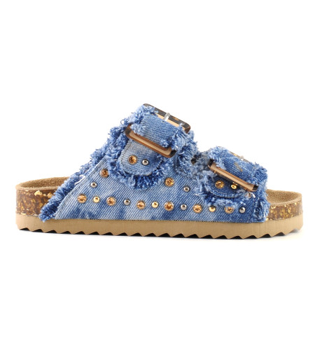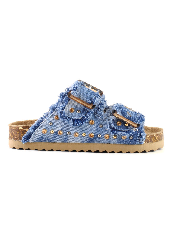 Les claquettes les plus appréciées de l'été, dans une nouvelle et fraîche réinterprétation du style denim. Le daim et l'originalité ludique de la texture du denim de coton sont agrémentés de clous lisses et de strass, alternés avec un bord frangé raffiné. Les jolies boucles transparentes ton sur ton rendent la chaussure légère et gracieuse. Parfait avec des robes légères et des pantalons chauds combinés avec des pulls oversize.