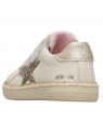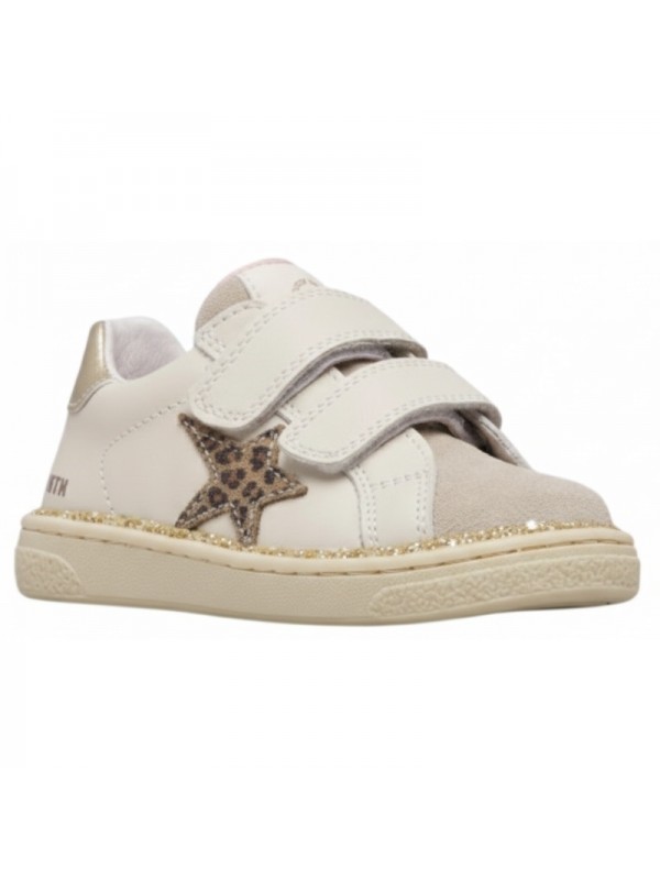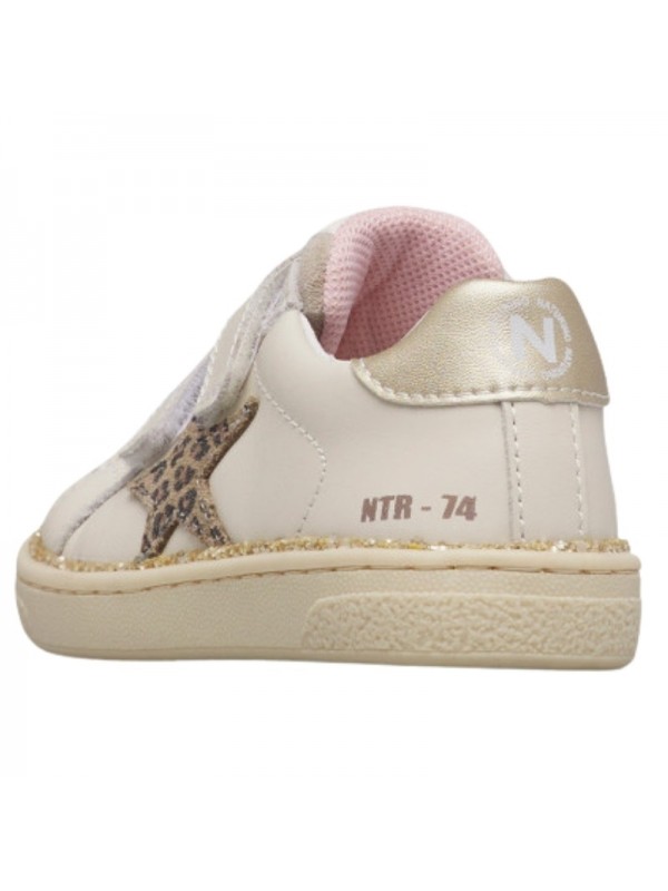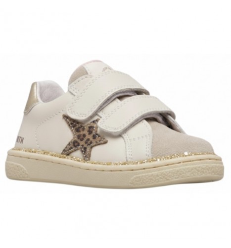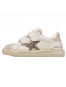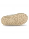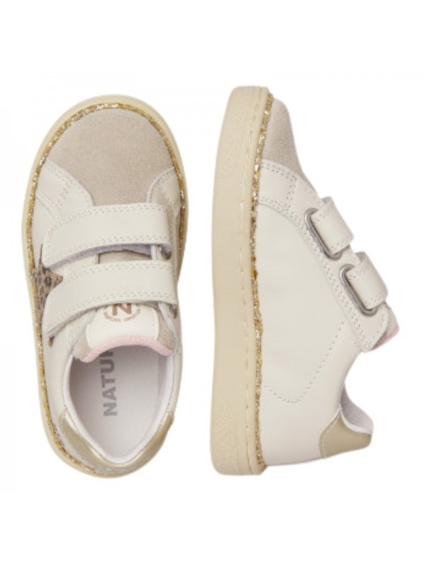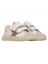 Basket avec tige en cuir beige et cuir nubuck ton sur ton, avec décorations en cuir métallisé. Le design est complété par une double fermeture scratch, une doublure en cuir et une semelle en caoutchouc antidérapant.