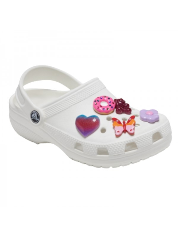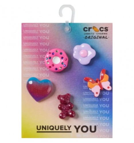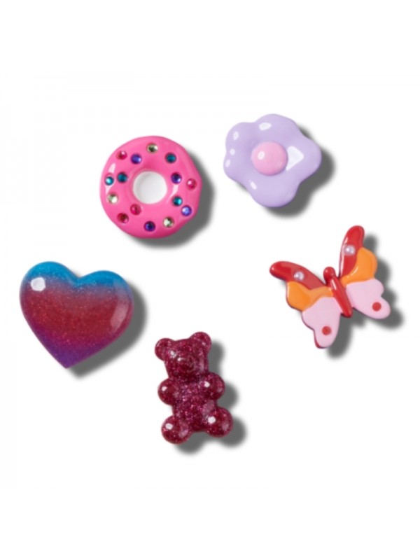 Ajoutez une touche de personnalité à vos chaussures avec ces Jibbitz™purple and pink fun 5 pieces. C’est l’ajout parfait à votre paire préférée de sabots, claquettes ou autres.