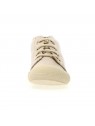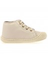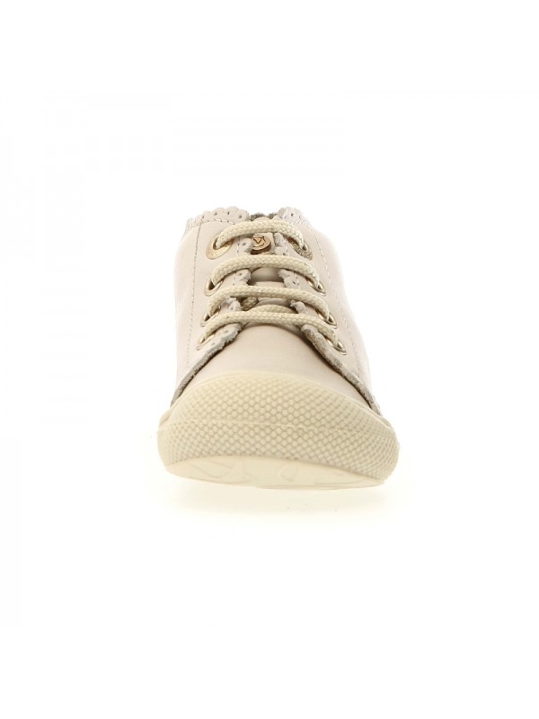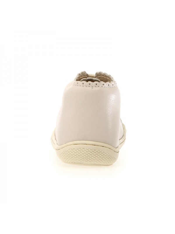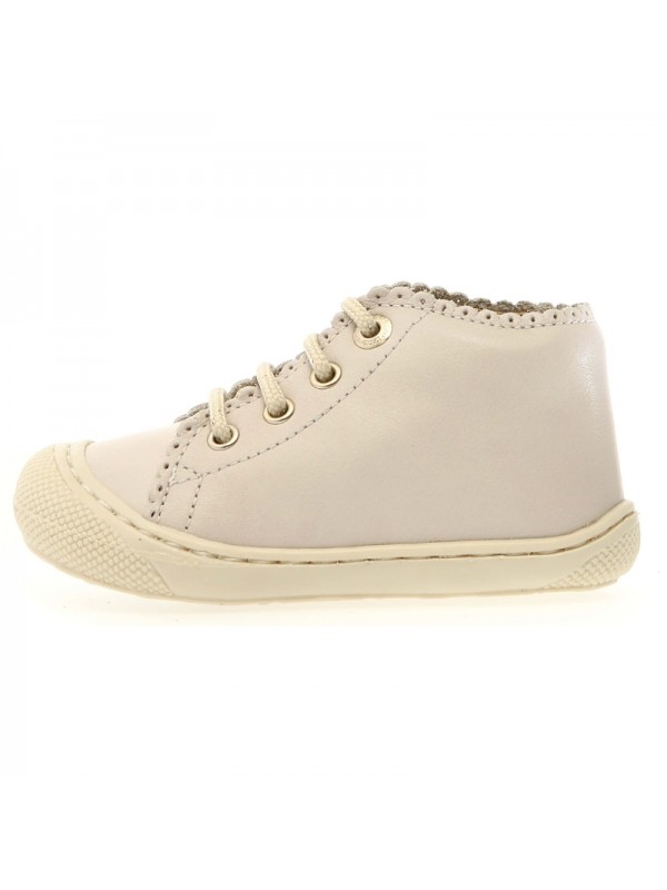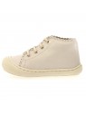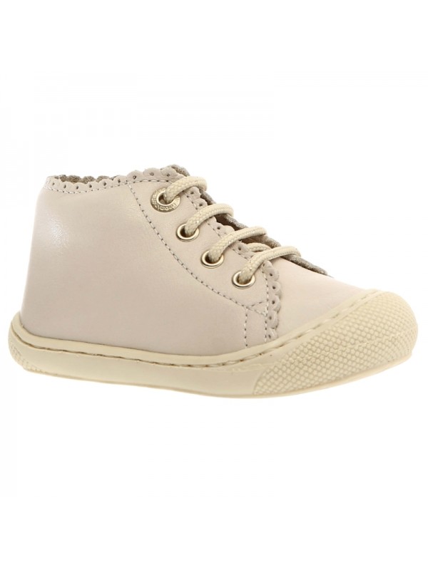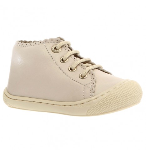 Chaussure premiers pas avec tige en cuir nappa brossé décorée d'éléments festonnés le long des profils. La construction est enveloppante, avec un talon soutenu, une doublure en cuir et une fermeture à lacets. Semelle en caoutchouc avec bout renforcé.