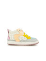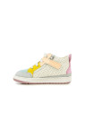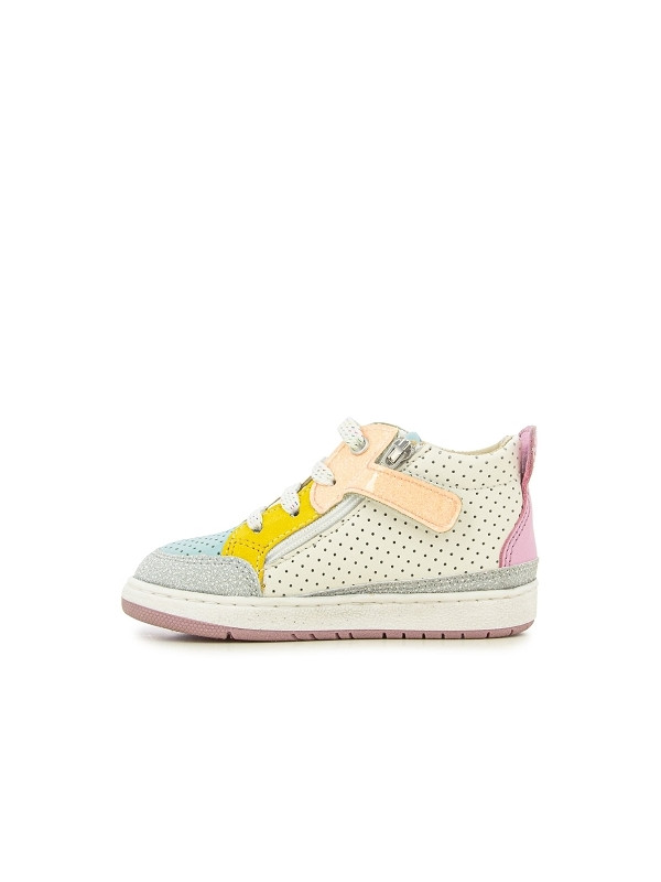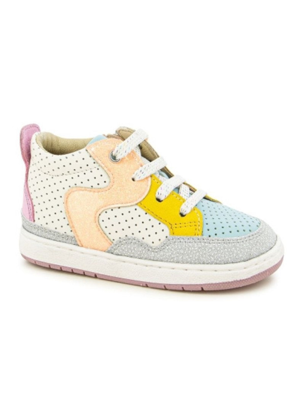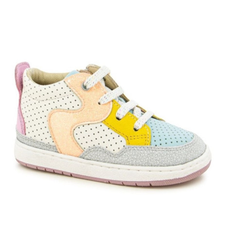 Cette basket premiers-pas à lacets pour enfants est présentée dans une version en cuir lisse blanc perforé avec des détails orange, bleu et rose. Cette chaussure souple et légère est conçue avec des matériaux de qualité pour le bon développement du pied et l'apprentissage de la marche. Sa tige haute avec laçage permet un bon ajustement et maintien de la cheville. Elle se chausse et se déchausse facilement grâce à son zip intérieur.