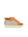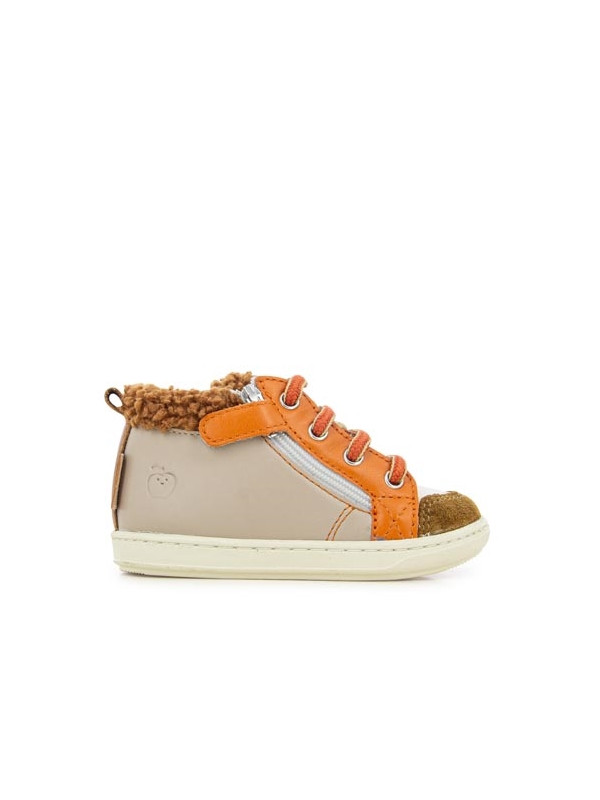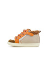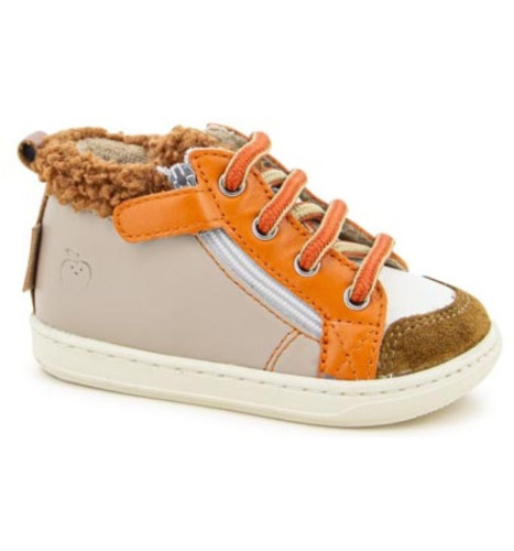 Cette chaussure premiers-pas à lacets pour enfants est présentée dans une version en cuir mastic et orange, avec une doublure synthétique. Cette chaussure souple et légère est conçue avec des matériaux de qualité pour le bon développement du pied et l'apprentissage de la marche. Sa tige haute avec laçage permet un bon ajustement et maintien de la cheville. Elle se chausse et se déchausse facilement grâce à son zip intérieur. Ce modèle taille petit.