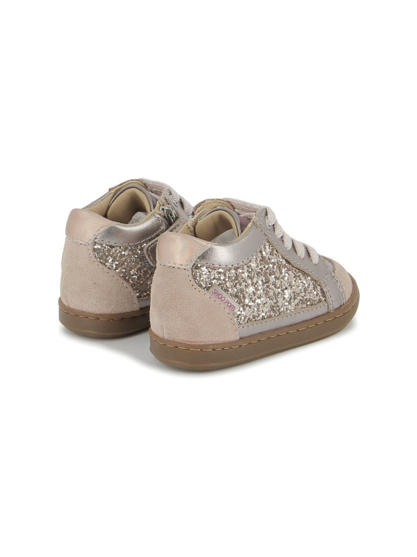 Cette basket premiers-pas à lacets pour enfants est présentée dans une version en cuir pailleté rosé et cuir doré. Cette chaussure souple et légère est conçue avec des matériaux de qualité pour le bon développement du pied et l'apprentissage de la marche. Sa tige haute avec laçage permet un bon ajustement et maintien de la cheville. Elle se chausse et se déchausse facilement grâce à son zip intérieur.