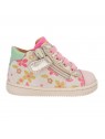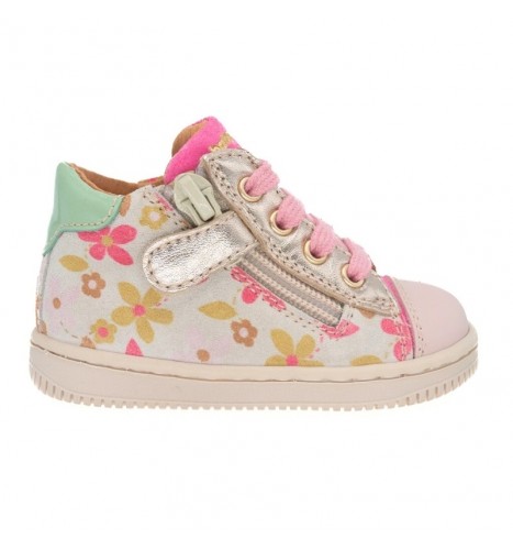 Chaussure petite fille bébé debout à lacets avec zip latéral pour une plus grande facilité. Tige en cuir couleur pastel et cuir imprimée floral sur le coté. Doublure en cuir et semelle en caoutchouc.