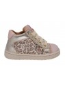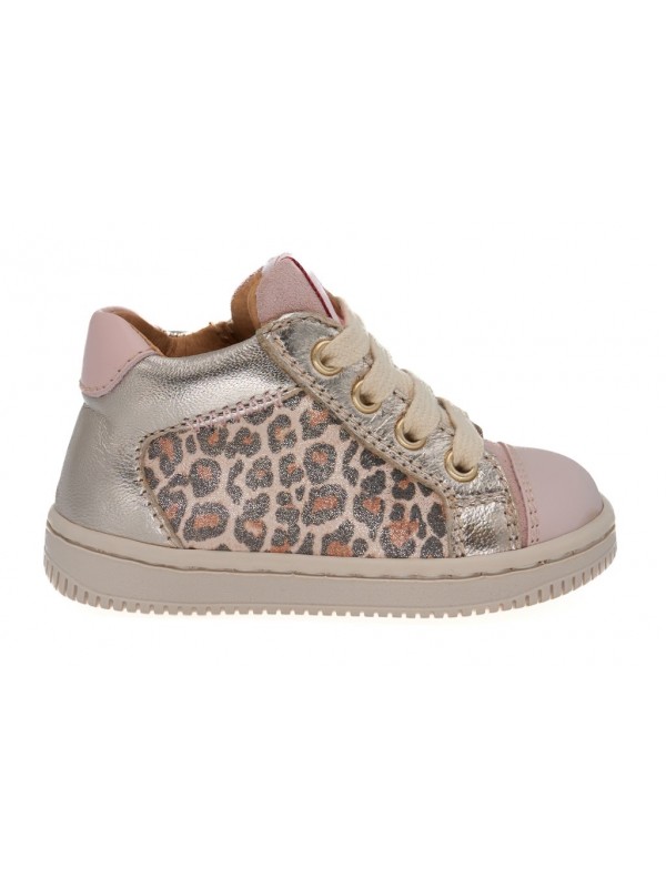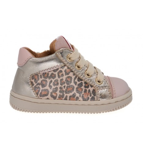 Chaussure petite fille bébé debout à lacets avec zip latéral pour une plus grande facilité. Tige en cuir saumon metal et cuir rose imprimée léopard sur le coté. Doublure en cuir et semelle en caoutchouc.