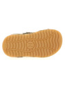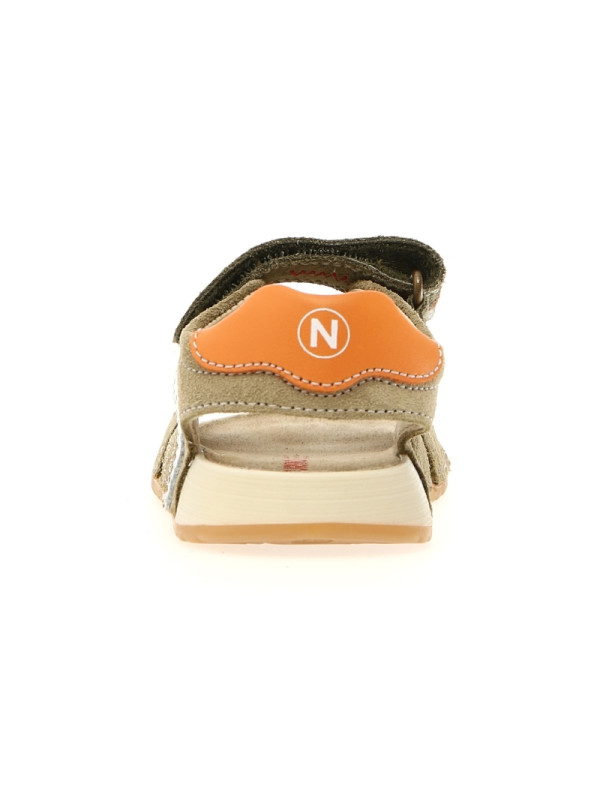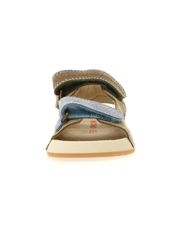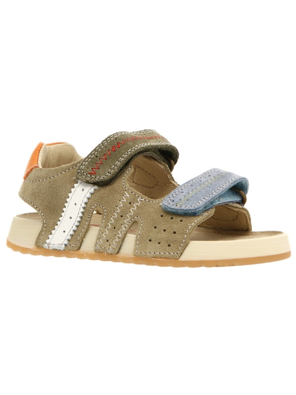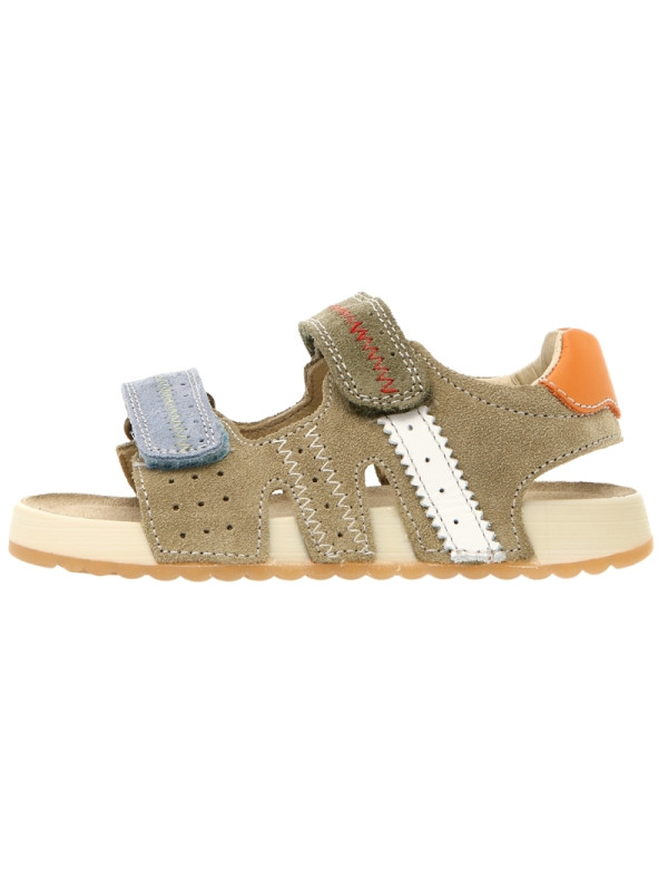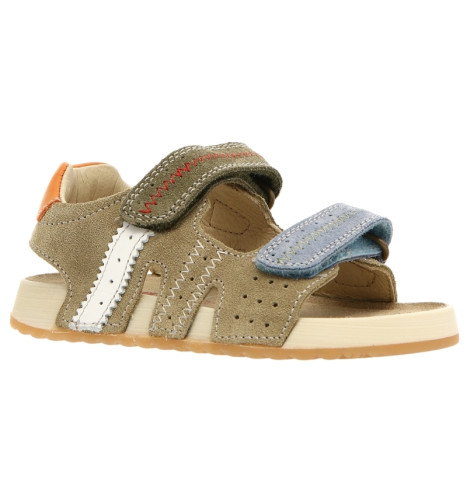 Sandale d'été en daim, avec jours, surpiqûres contrastées et empiècements en cuir coloré. Fermeture double scratch, doublure en cuir et semelle intérieure en daim. Semelle en caoutchouc avec semelle d’usure contrastée.