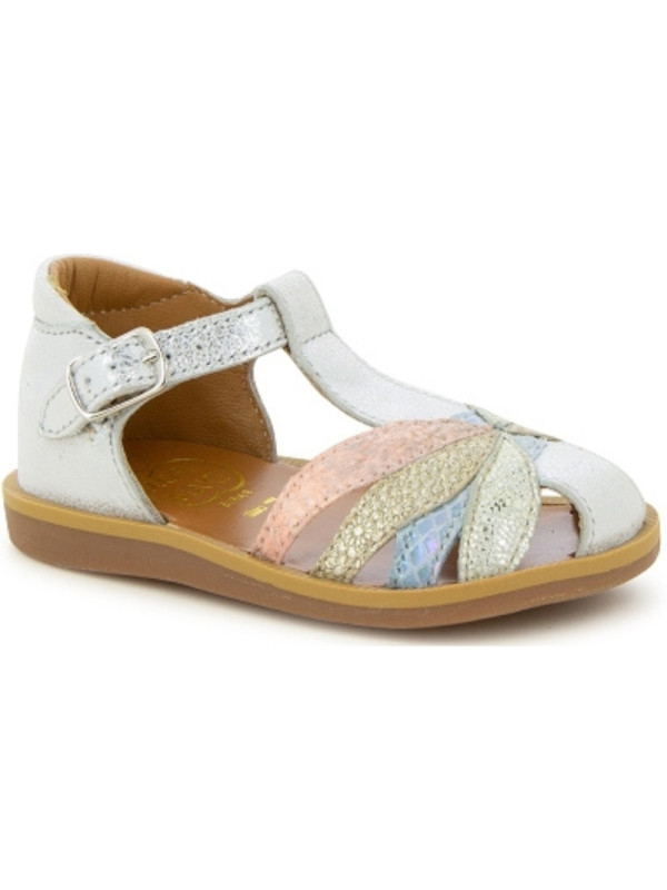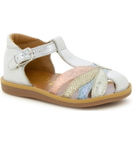 Cette sandale premiers-pas est présentée dans une version en cuir métallisé argenté, avec des brides multicolores. Cette chaussure souple et légère est conçue avec des matériaux de qualité pour le bon développement du pied et l'apprentissage de la marche. Elle possède une tige haute pour un maintien optimal de la cheville et du cou-de-pied et Elle s'ajuste facilement à la cheville grâce à sa boucle réglable.