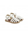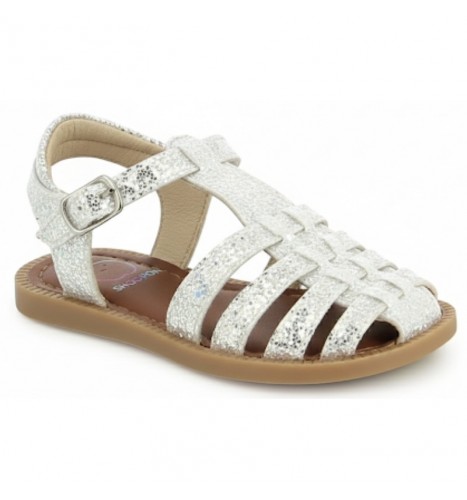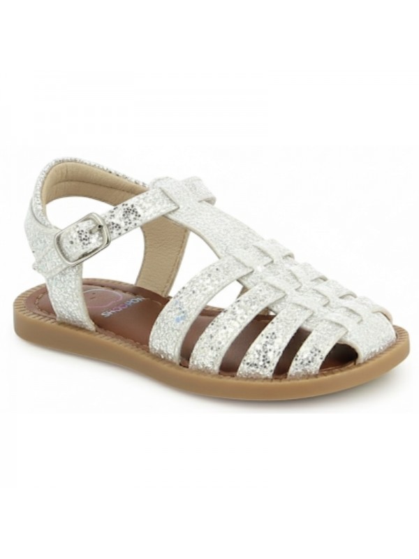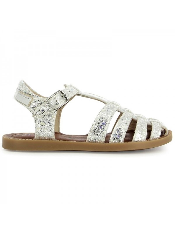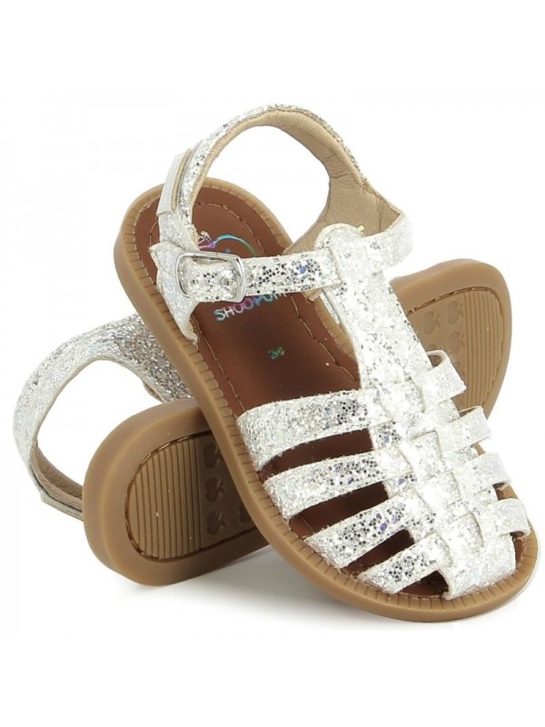 Cette sandale pour enfants est présentée dans une version en cuir lisse glitter blanc argenté. Cette chaussure souple et légère est conçue avec des matériaux de qualité pour le bon développement du pied. Elle se chausse et se déchausse avec une boucle. Son bout fermé protège les orteils.